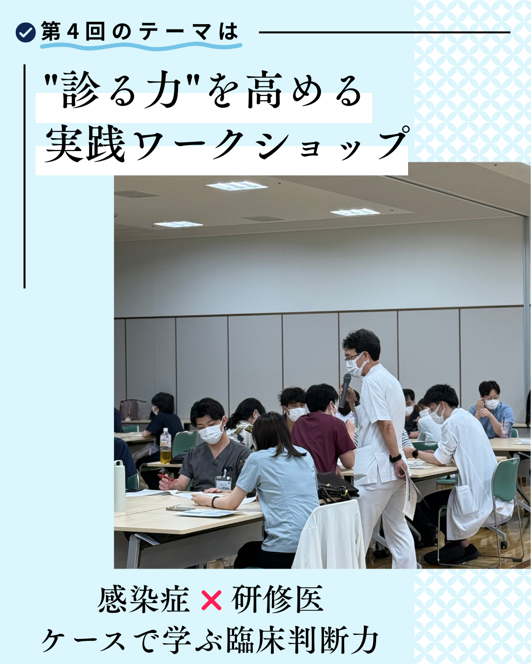 今回の3病院のつどい場は『診る力を高める実践ワークショップ』と題し、講師の先生をお迎えして研修医向けの感染症勉強会を開催しました。実際の症例を交えながら、皆で考え、学び合う時間となり、研修医の先生からは、「ドクターGみたいで面白かった!」という声も聞こえてきました。「診る力」「考える力」が鍛えられる濃密な時間となりました。講師の先生、指導医の先生方、ご指導ありがとうございました。